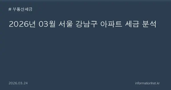 서울 강남구 아파트 세금 이슈 개요 # 2026년 3월, 서울 강남구의 아파트 시장은 다양한 거래가 이루어졌습니다. 이번 분석에서는 세금 관련 사항에 대해 살펴보려고 합니다. 강남구는 부동산 시장에서 상당한 인기를 끌고 있으며, 이에 따라 높은 세금이 부과될 수 있습니다. 취득세, 양도소득세, 종합부동산세 등 다양한 세금이 해당 거래에 적용되므로, 투자자나 주택 소유자들은 세금 계산을 정확하게 이해할 필요가 있습니다.